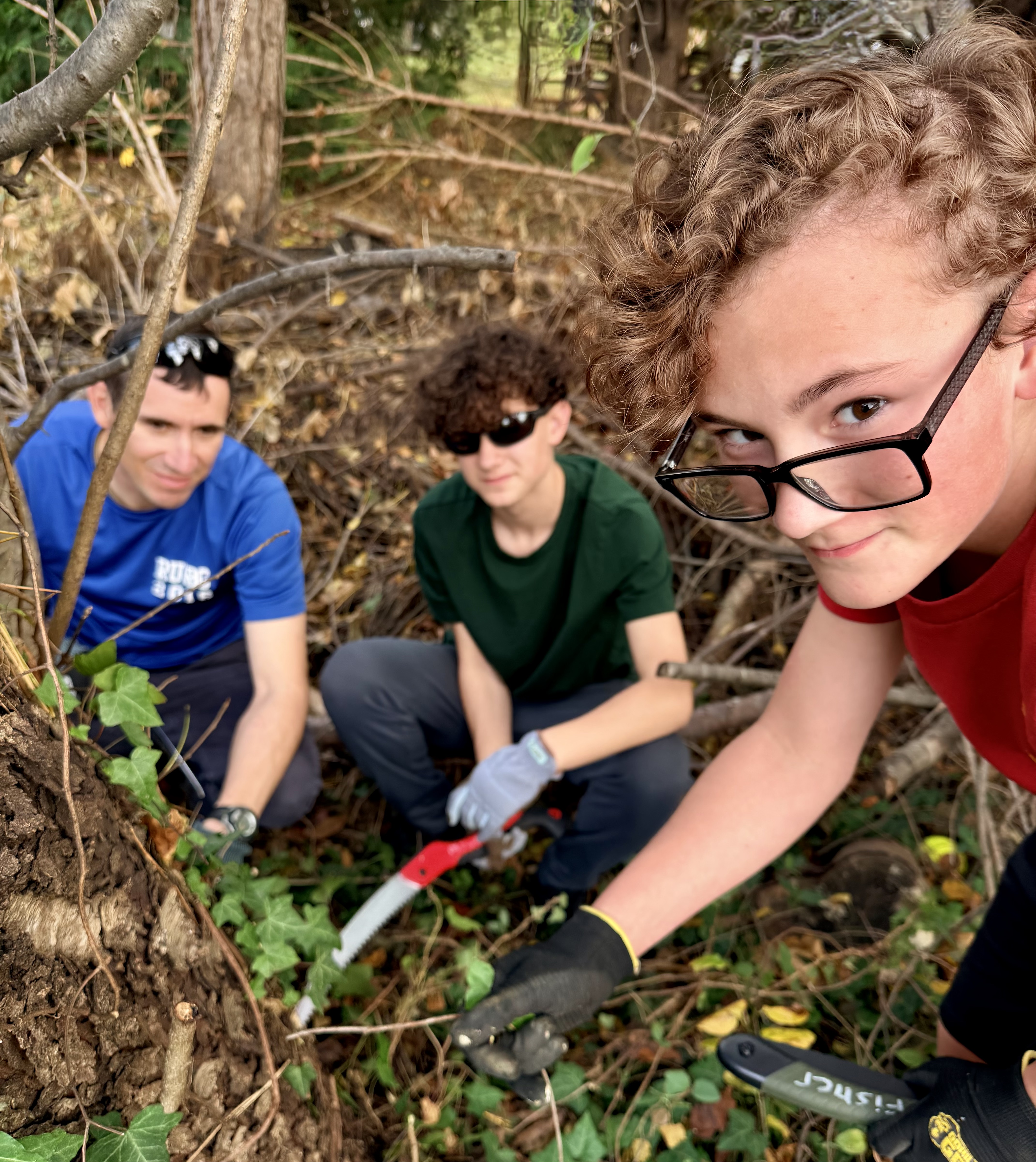 Members of the Campbell family establish a safety ring around a tree, removing English Ivy